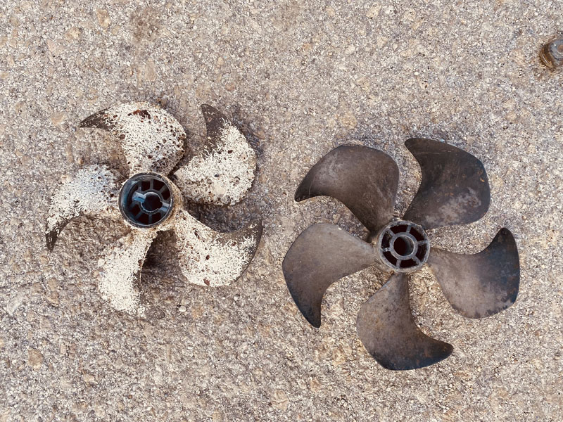 I removed my new plastic sidepower props after six months they looked like this. I then cleaned one in acid which removed the growth. now want to antifoul with something. See before and after photos of cleaning.
