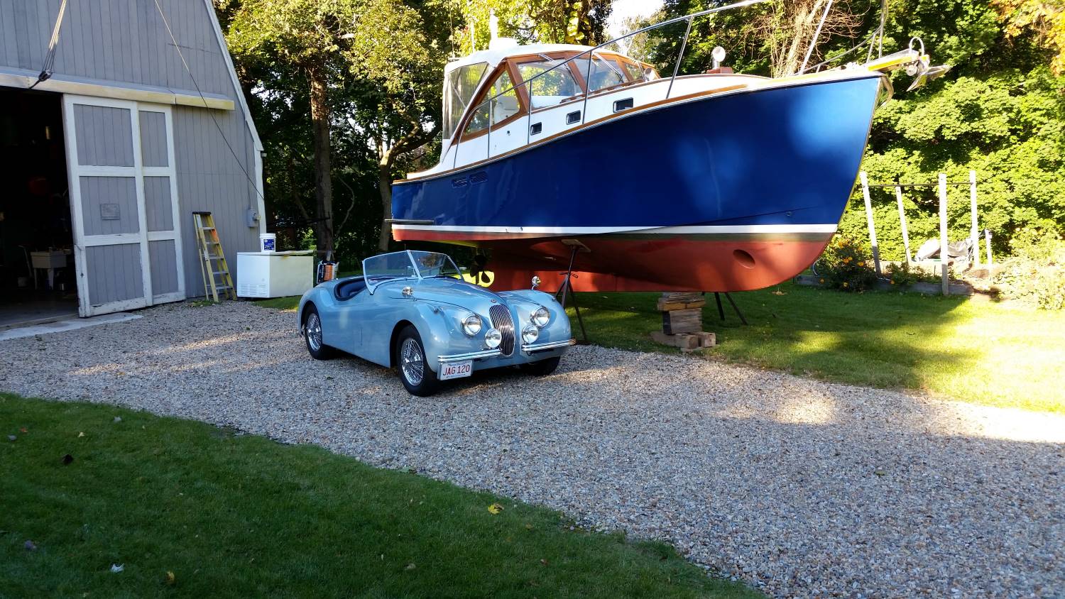 Fine looking car, I probably could not fit in it. Glad there are no roof racks there. AND, That is a gorgeous boat.
