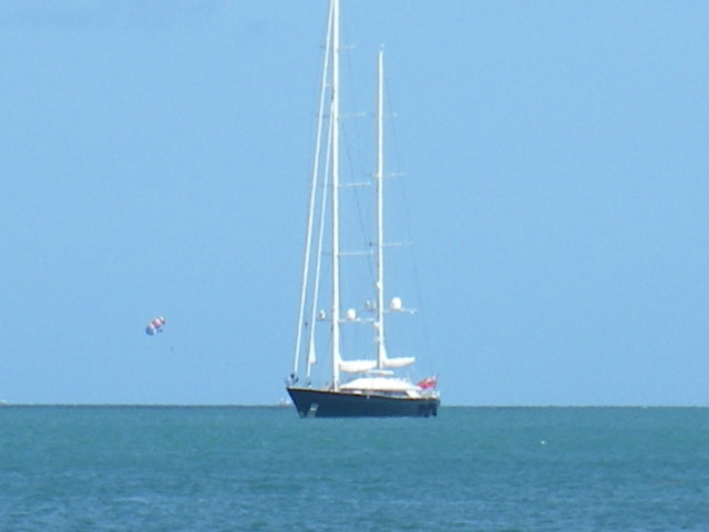 I apologize for the poor photos. I actually believe the flag was Cayman. The first photo was when we were arriving at the West Bight so the yacht was about a quarter mile away.