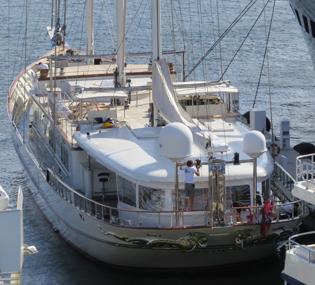 That's S/Y Montigne with the Dragons on the stern. She was recently in for charter guarantee work at Solent Refit in Southampton, UK. She is one hell of a sight with her sails up, an absolutely gorgeous ship!! I think she is up for sale if you have a spare $16.5million.