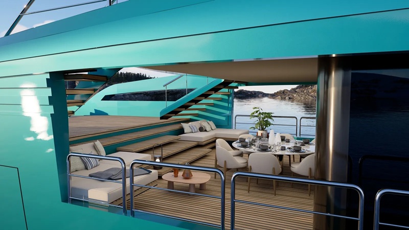 2. In terms of performance, this yacht is expected to be fitted with a pair of CAT marine diesels. These will run the vessel to an estimated 14-knot top end. Although, if a more environmentally conscious owner signs contract the propulsion setup could be be swapped for a diesel-electric system. Using this setup this propulsion onboard will reduce fuel consumption by 20% for a yacht this size.