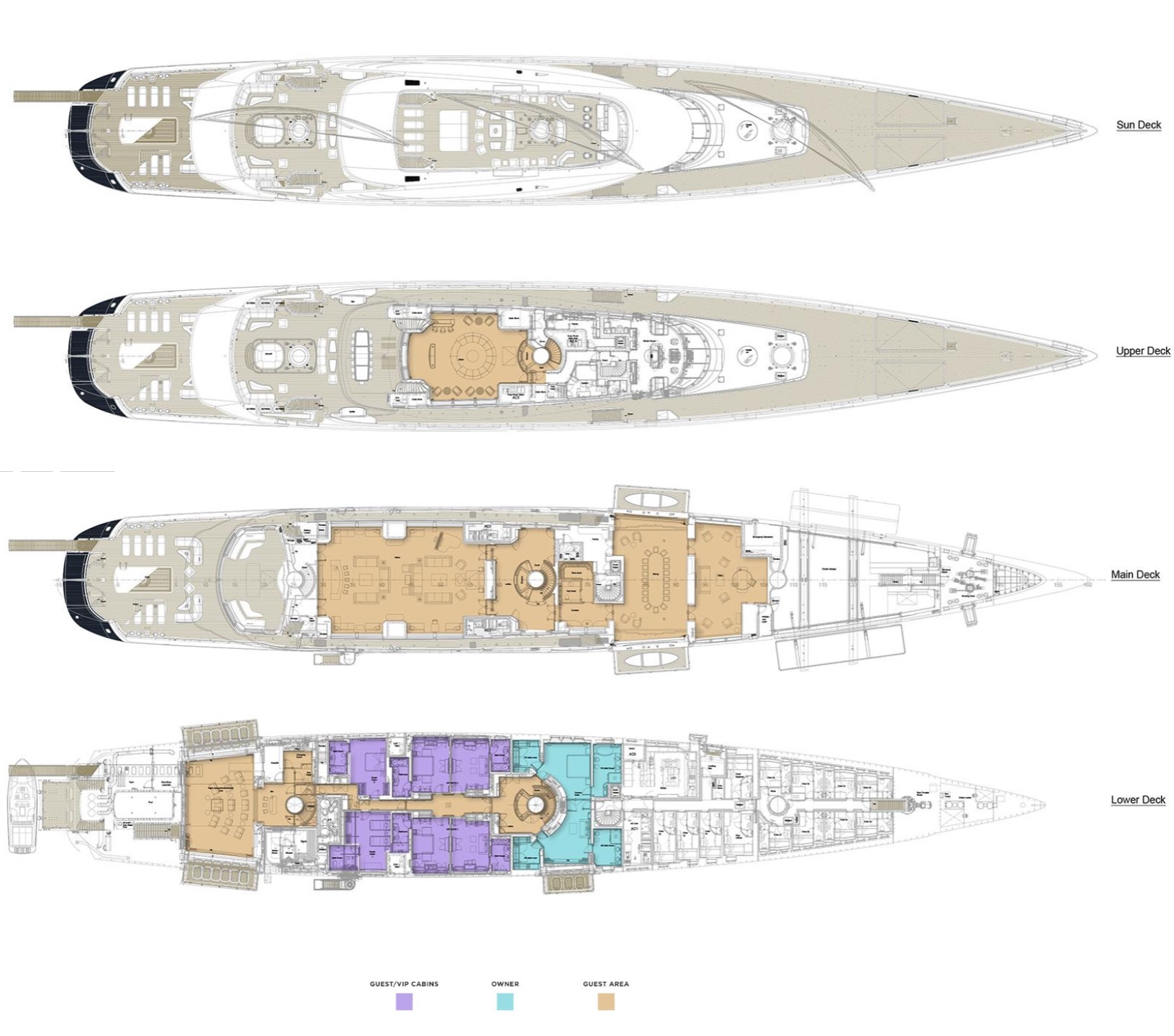 These are very interesting and not what I expected. I am not sure what the beach club normally looks like but I have always thought the best use would be a combo beach club/cinema to best utilize the space. I am fairly surprised on the master location as the main deck where the dining room and further saloon would be perfect, have more space, and views. If it is for the centerline and low CG perspective to minimize motion, I’d almost think using both would be ideal. Seems the dining rooms are some of the least used parts on these yachts so such pristine locations I would consider using differently.