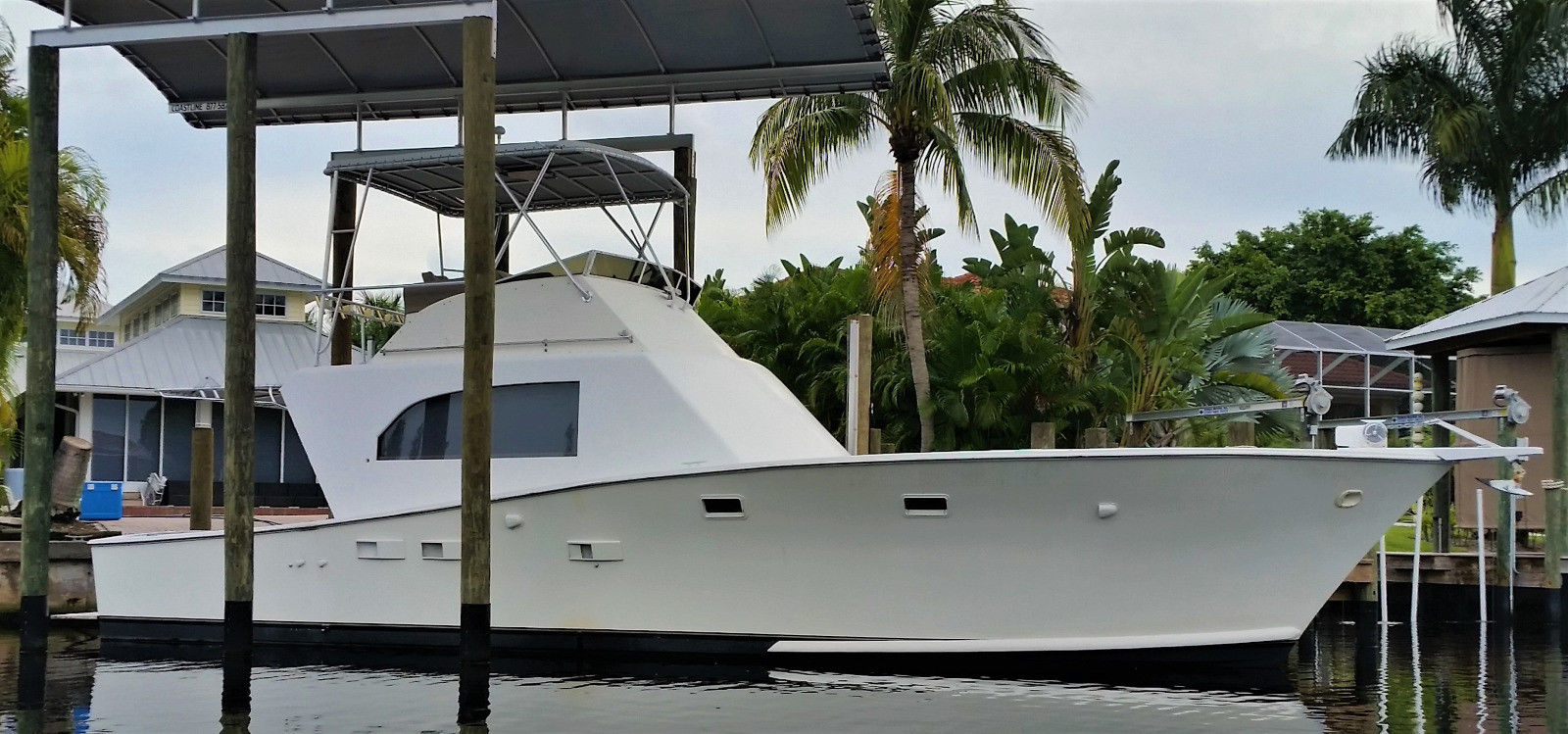 I have been inspired by some of the great projects that are posted in this forum. Here are a few of the simple ones I completed on my 82 42' over the past few years. I removed the side cabinet from the helm and moved the passenger seat forward. When I had a new enclosure made I removed the tinted visor and all wood from the flybridge.